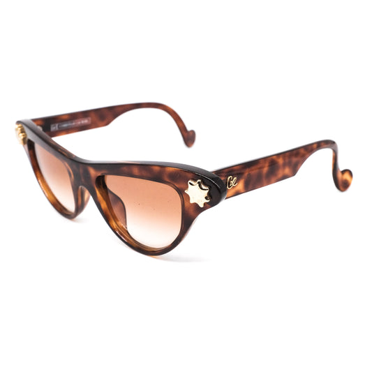 Christian Lacroix 7353 vintage brown tortoise acetate cateye sunglasses with large shiny gold pins on the rim, 80s nos Germany