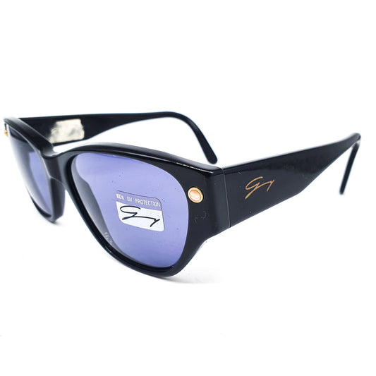 Genny 169s black cellulose acetate cat eye sunglasses With dark blue lenses and shinny golden pins, Italy 70s NOS