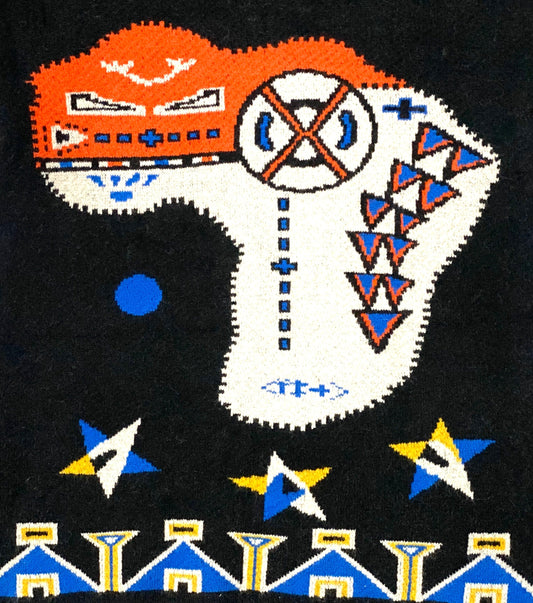Warm knitted black sweater dress with blue/orange/white stylized / abstract Africa motif Noze with tags