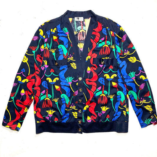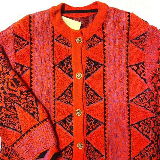 Cool baroque oversized cardigan, red with black and fucsia motif allover, size M mint