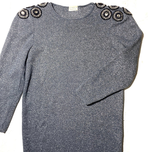 Nicolet Knitwear silver sweater dress with preciously hand embroidered shoulders, mint 80s Italy
