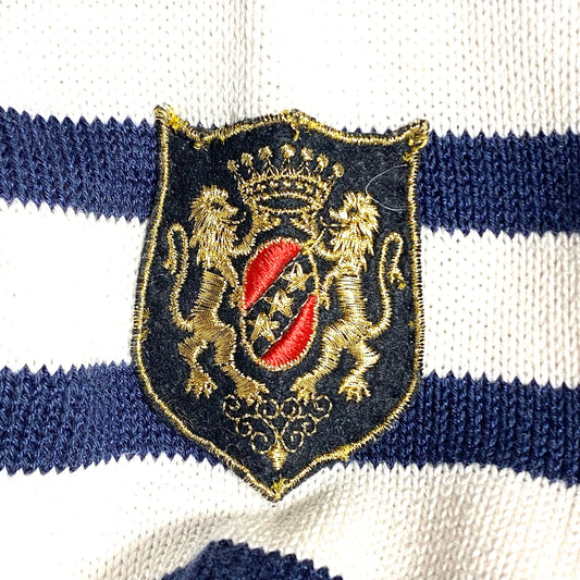 FabrizioG cotton knit mariner style sweater, navy/white horizontal striped with royalty embroidered patch, 1980s NOs Italy