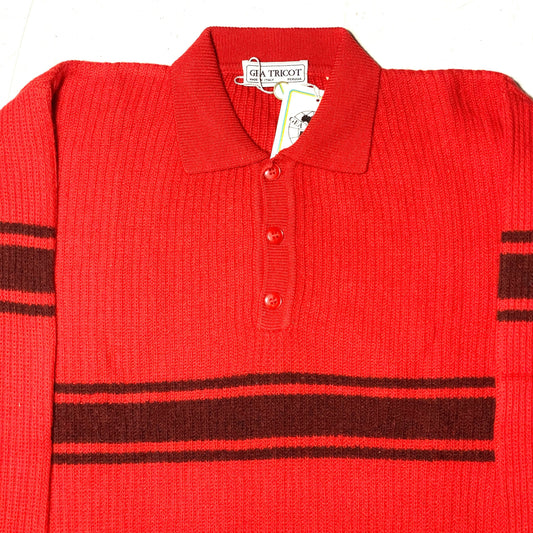 Gea Tricot red ribbed wool collared sweater with navy stripe, sz 48 new and unworn from deadstock
