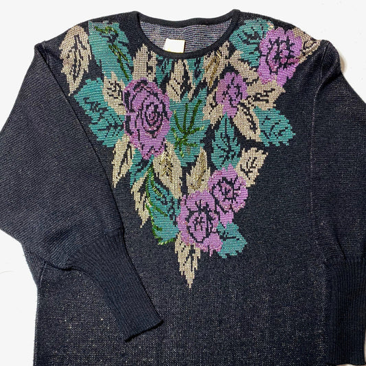 Glittery Black knitted sweater dress with embroidered detailed floral motif, mint condition sz 44, L