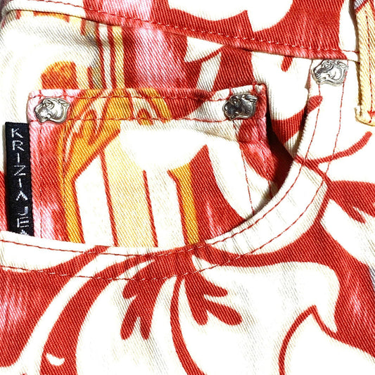 Krizia Jeans pink Waikiki surf boards & Hawaiian flowers denim trousers sz 28, Mint