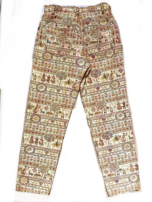 Amaclan Portofino gorgeous beige jacquard trousers w farm Provence scenes allover, mint sz S ladies