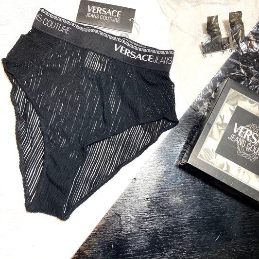 Versace Jeans Couture NOS 90s semi transparent ribbed panties with greek and signature on waistband.