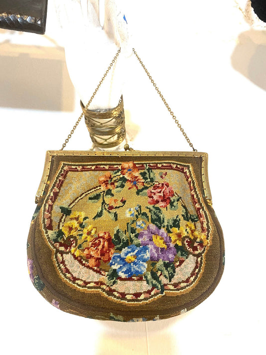 Auth. 1920s petit point crochet hand bag with floral motif and brass frame and chain, 1930s ca, mint condition.