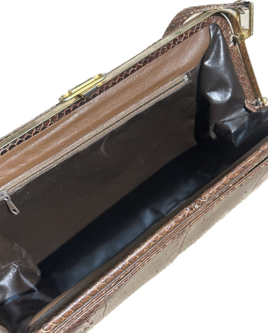 1970s artisanal snake leather shoulder bag, brown phyton skin evening pouch bag w/ golden brass framing, NOS 70s.
