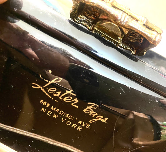 Lester Bag NY 50s black patent bag w sculpted brass closure and black/gold chain, great condition, gorgeous