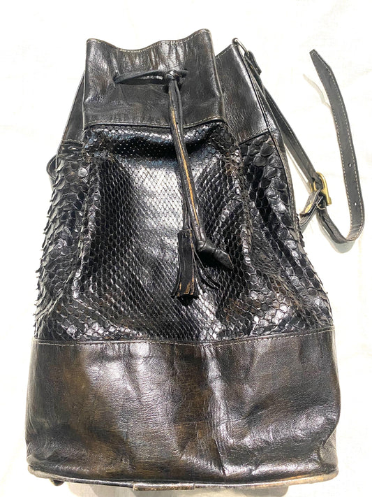 Black snake and cuir leather bucket it-bag w canvas lining, never worn and mint, 80s Italy