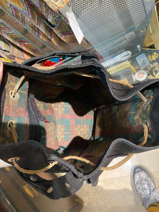 Artisanal black suede leather backpack / bucket bag with cotton canvas lining, NOS 90s Italy