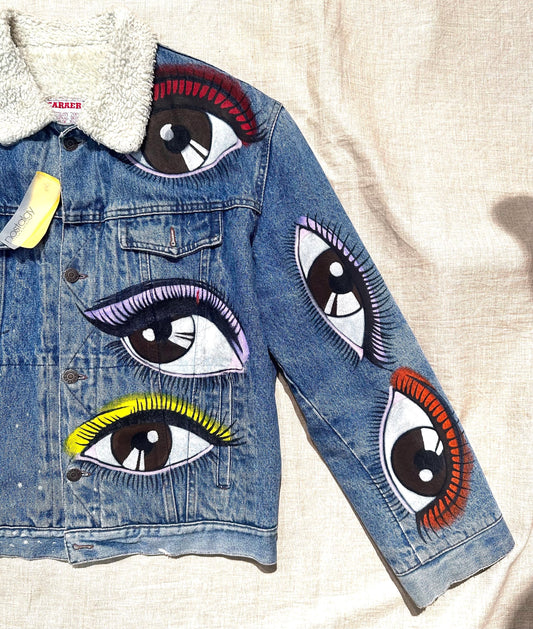Carrera Jeans Sherpa Trucker denim indigo Eyes custom hand painted jacket, hand painted denim jacket made to order, custom made jacket