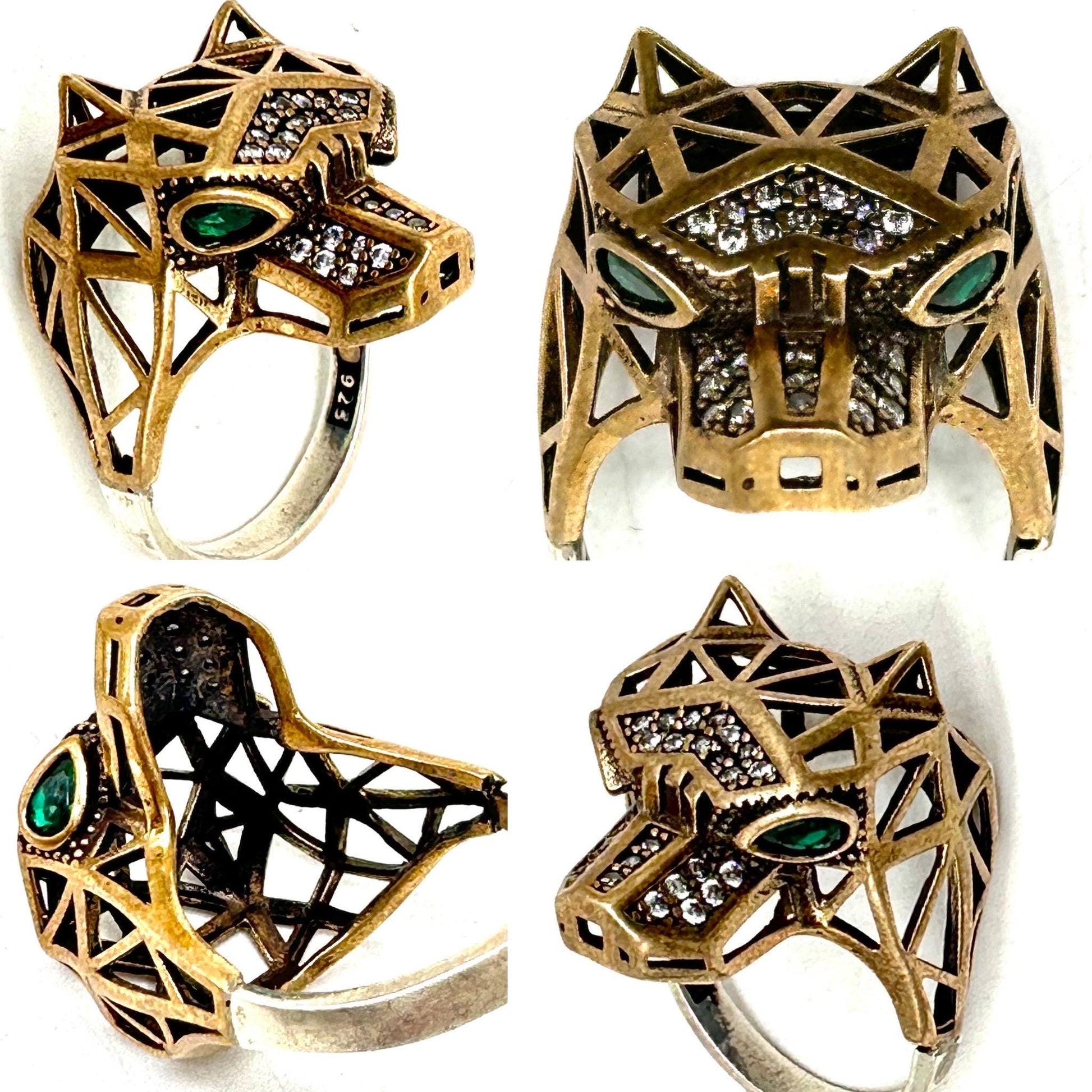 Anubis low polygonal designed ring in 925 silver with the Polygonal cutoff head in brass embellished with green crystals for the eyes and white ones on the muzzle; a really incredible ring, with a blend of modern and vintage styles in the meantime, coming brand new from artisan deadstock.-“