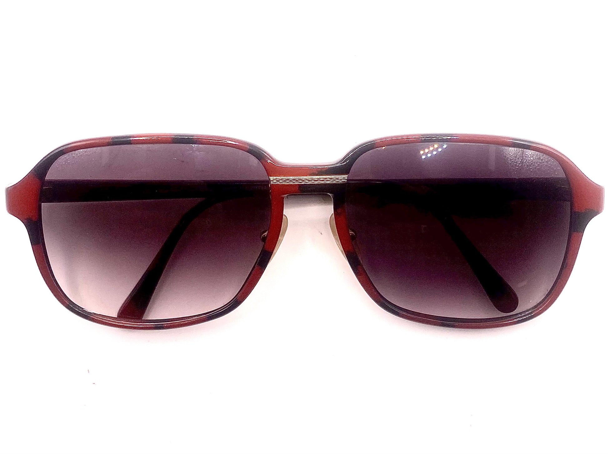 Burberrys 8278 by Safilo square red tortoise textured acetate Optyl frames made in Austria in the 80s, with golden metal textured details at the nose bridge and hinges, mounted with grey fade CR39 sun filters of the finest quality.