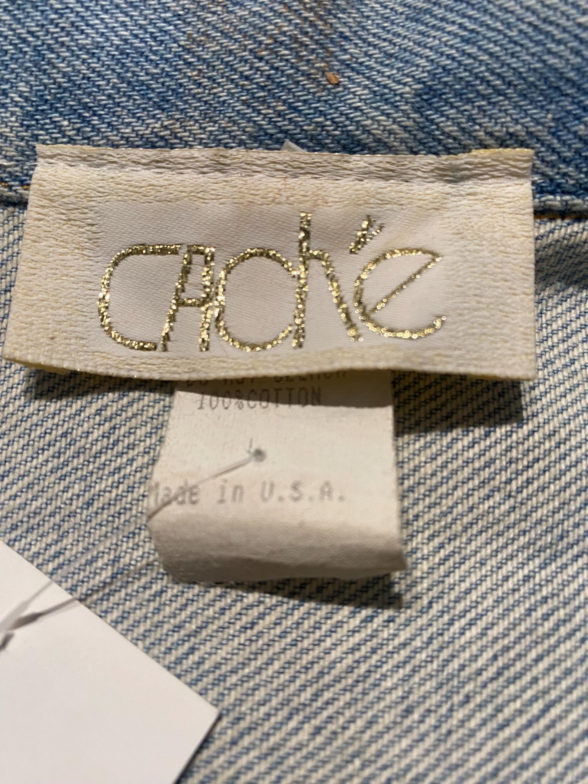 Caché USA light blue denim vest customised w leather, golden jewel buttons & studs, sz L