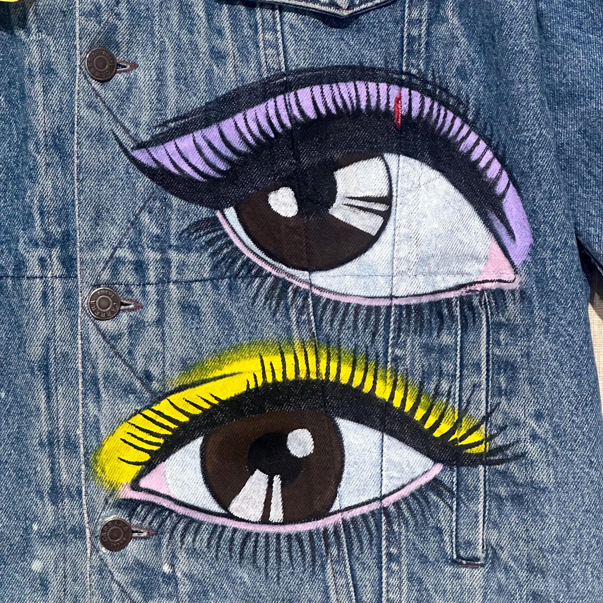 Carrera Jeans Sherpa Trucker denim indigo Eyes custom hand painted jacket, hand painted denim jacket made to order, custom made jacket