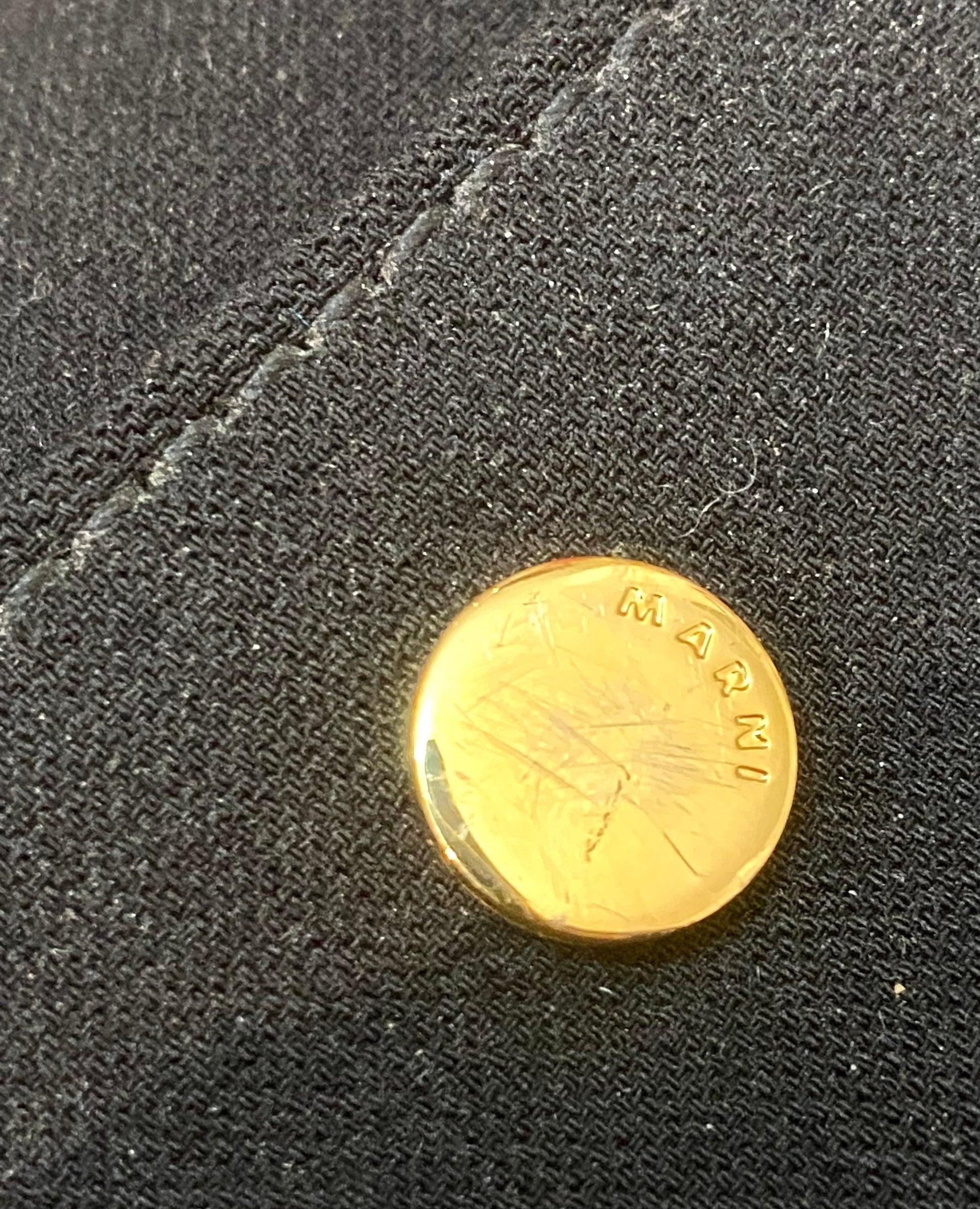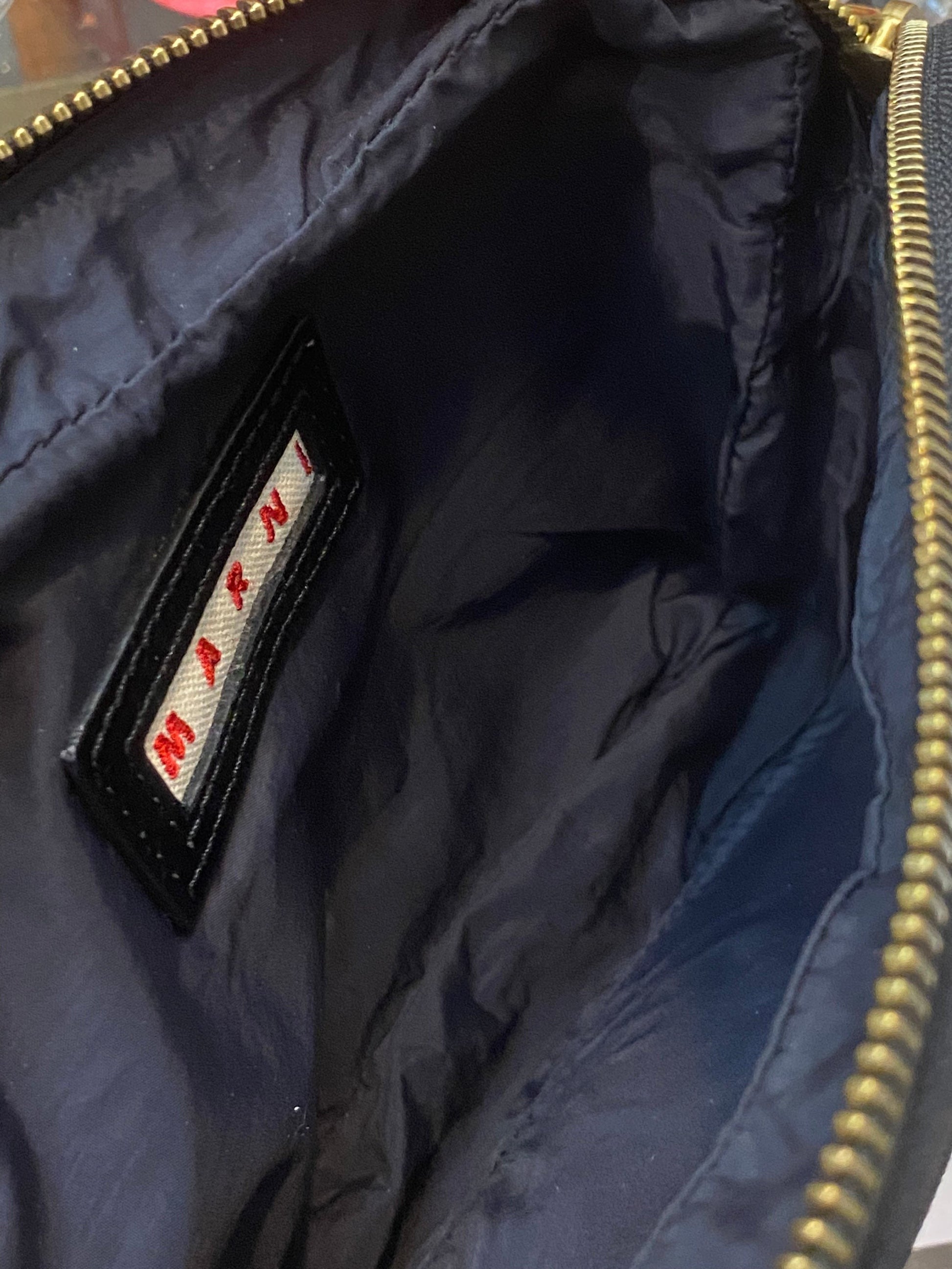 Marni cute black canvas zippered pouch bag, with leather strap/ handle press printed with the brand’s name and a cute beaded signature penguin keychain. In almost perfect condition, slight scratches to the golden snap button on the front as visible in the pictures, other than that absolutely perfect.