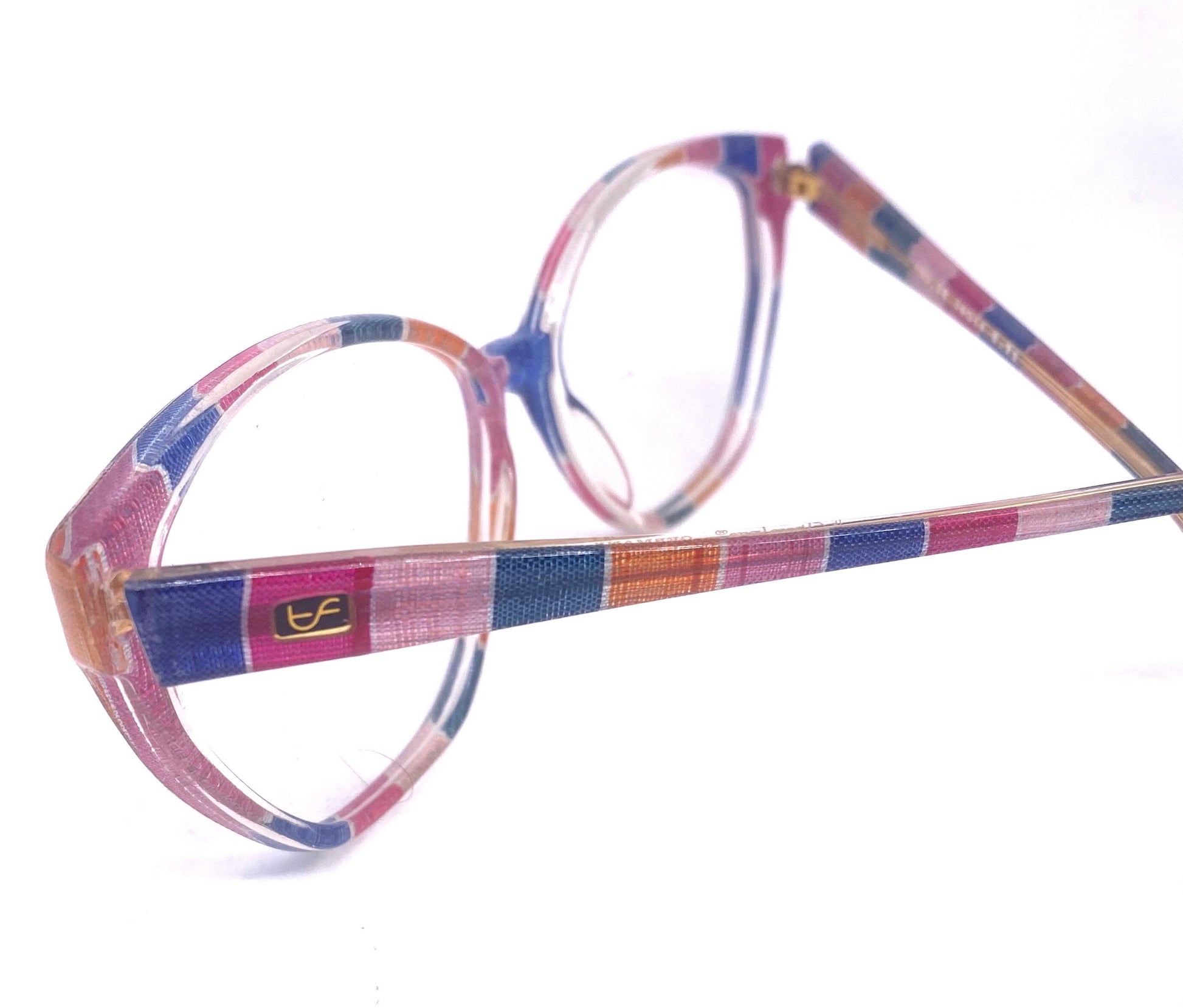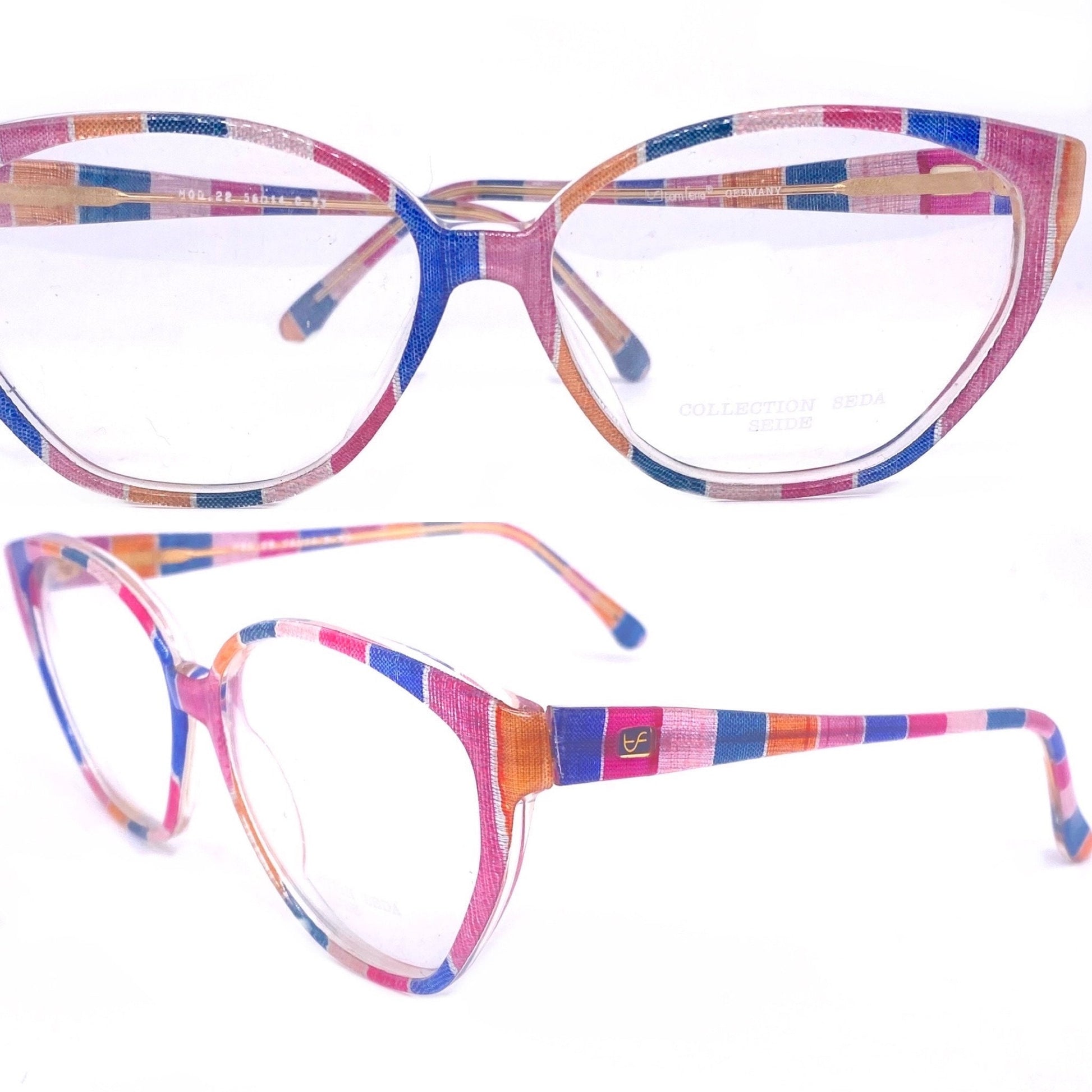 Tom Ferra colorful translucent cateye glasses w real striped silk fabric inlaid, NOS 80s Germany