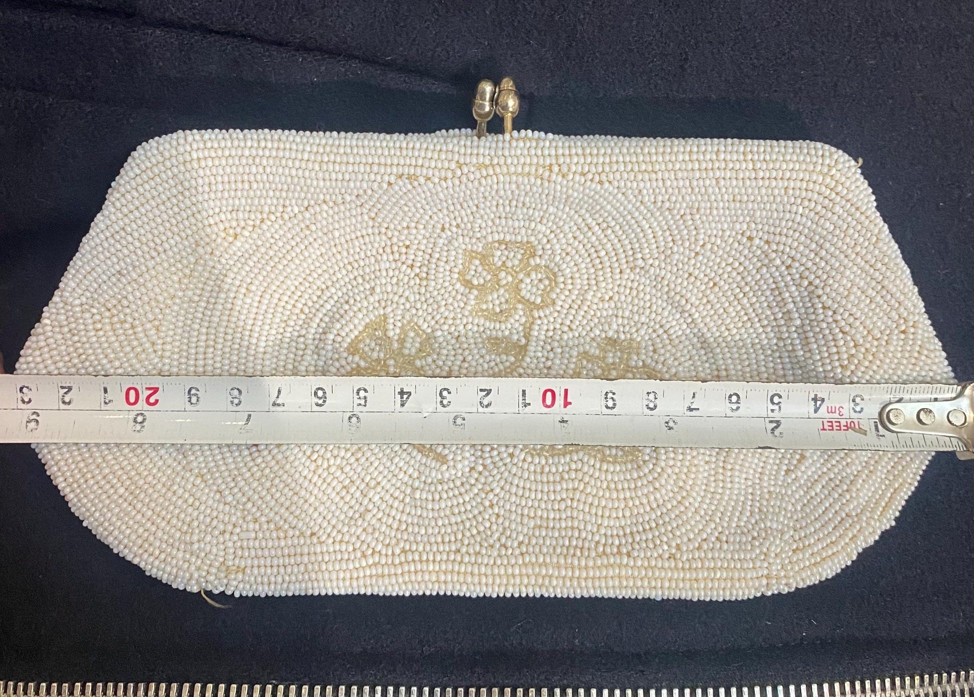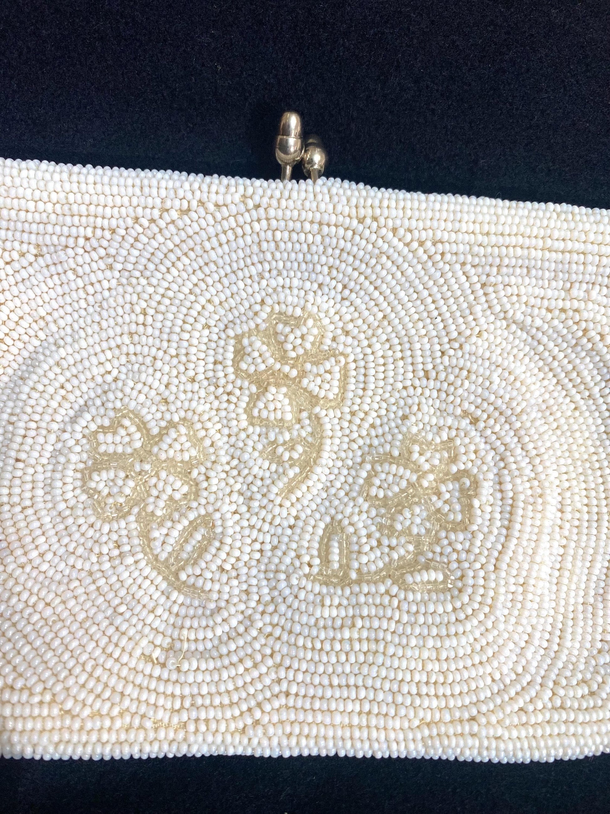 1940s ca 4 leaf clovers hand-embroidered white beads pouch with clasp closure and silk lining, in great condition