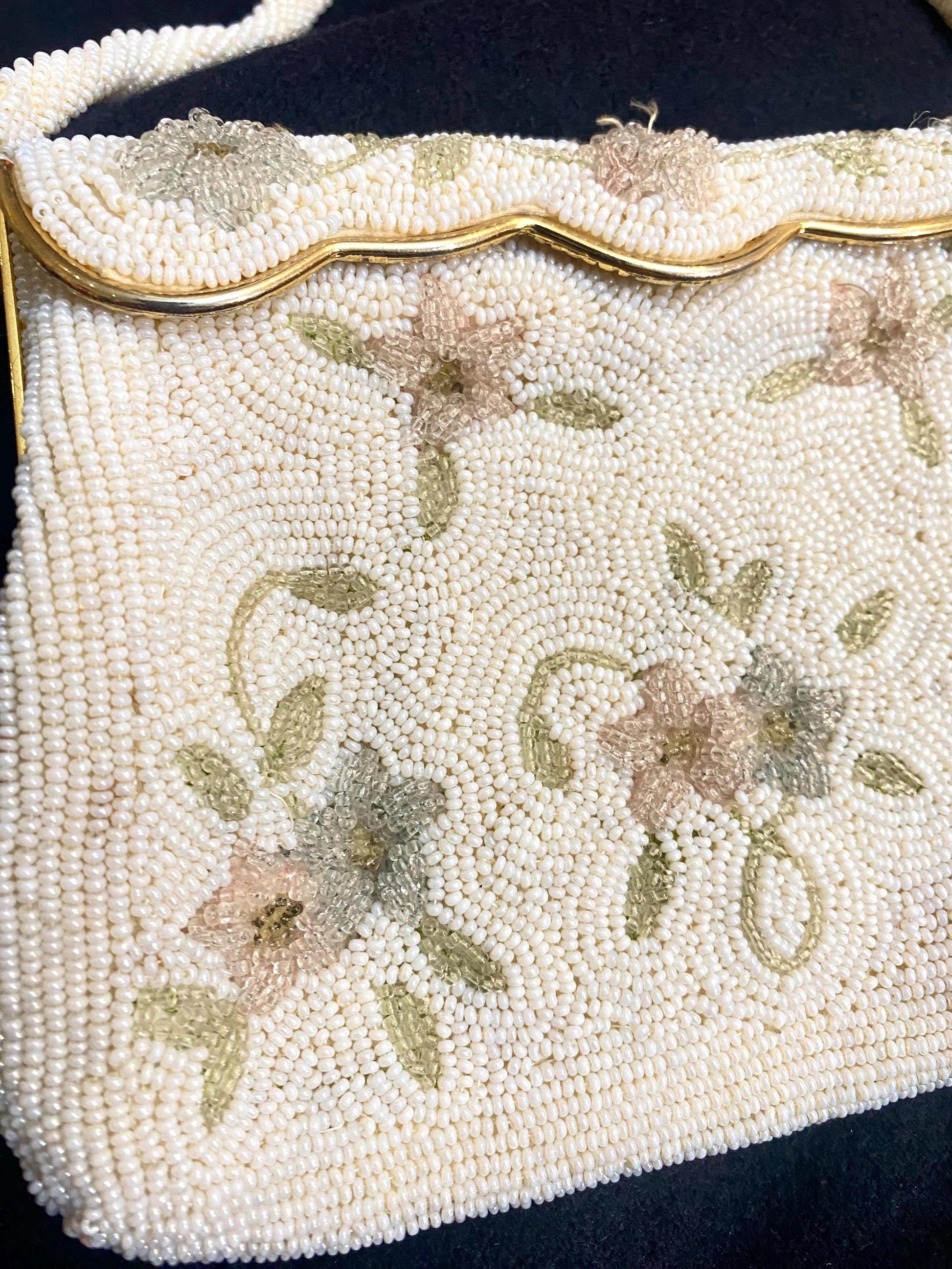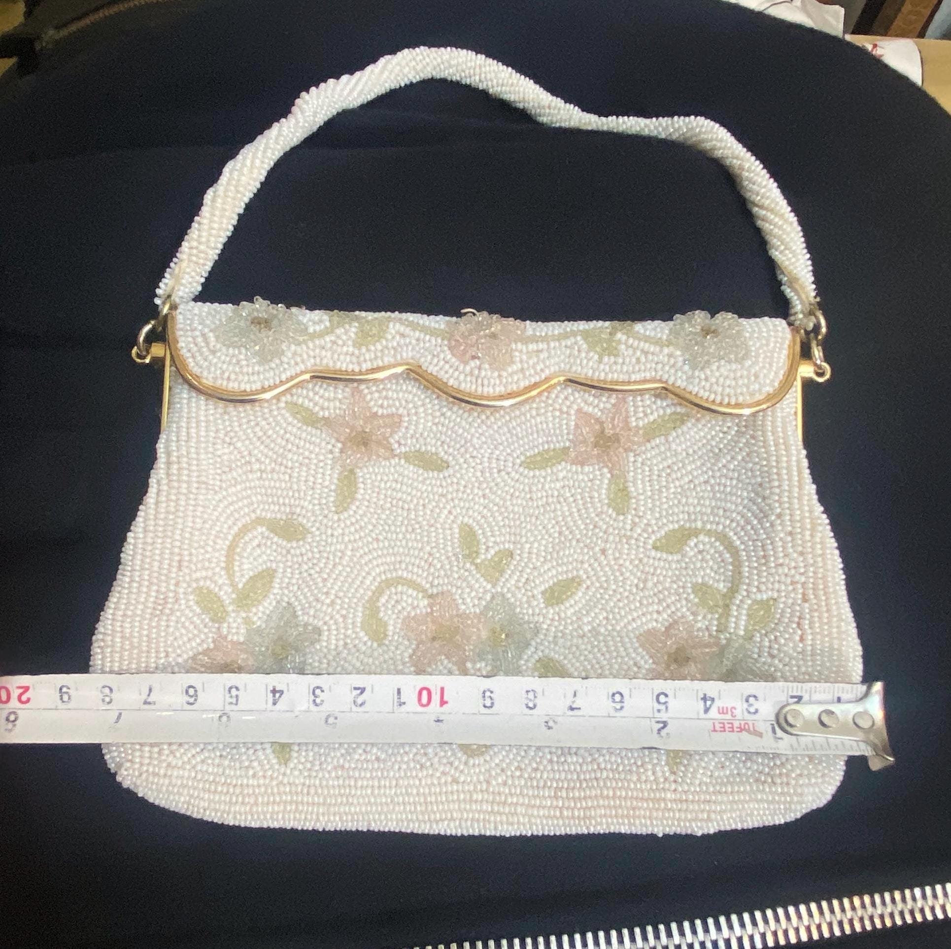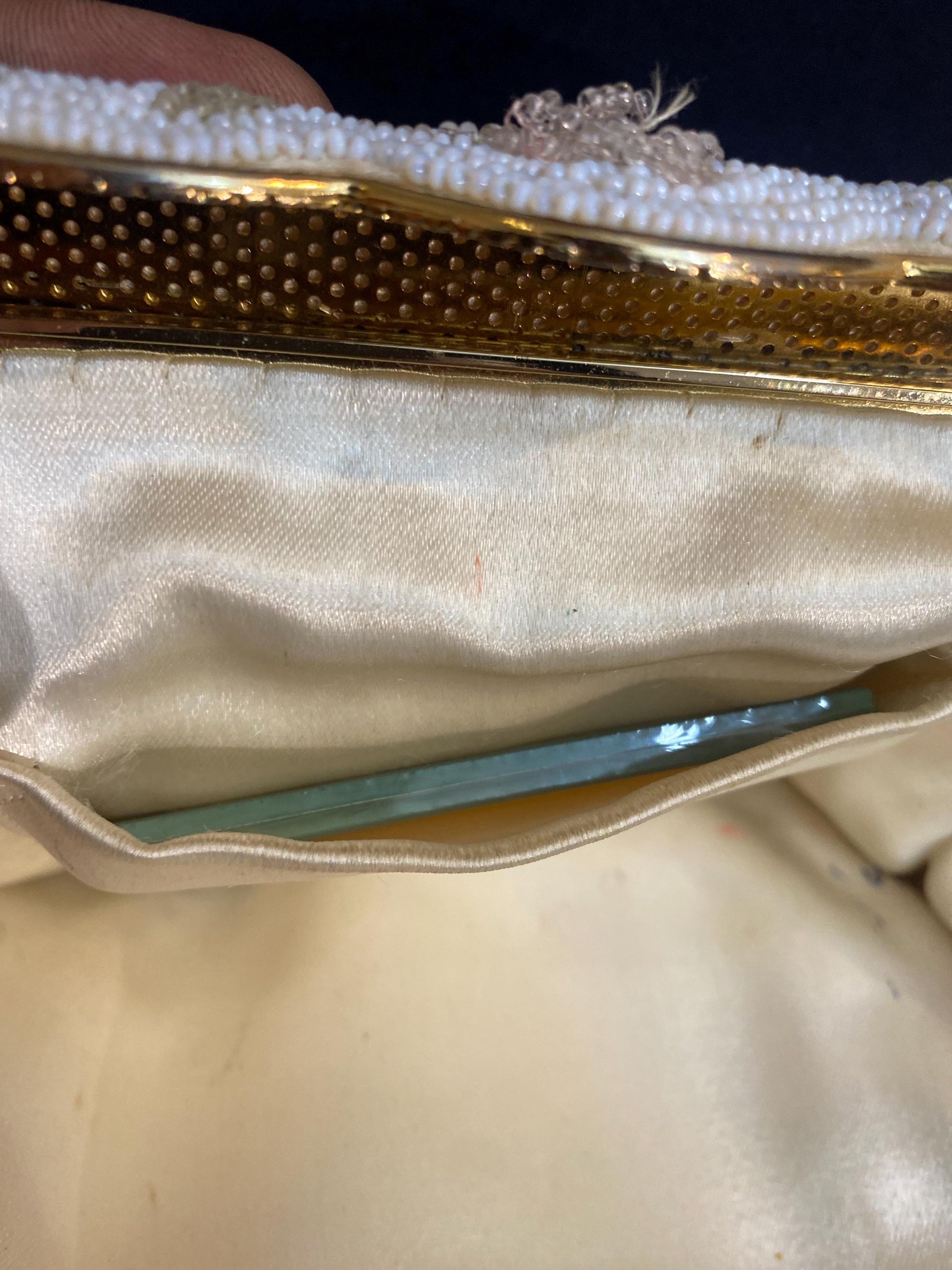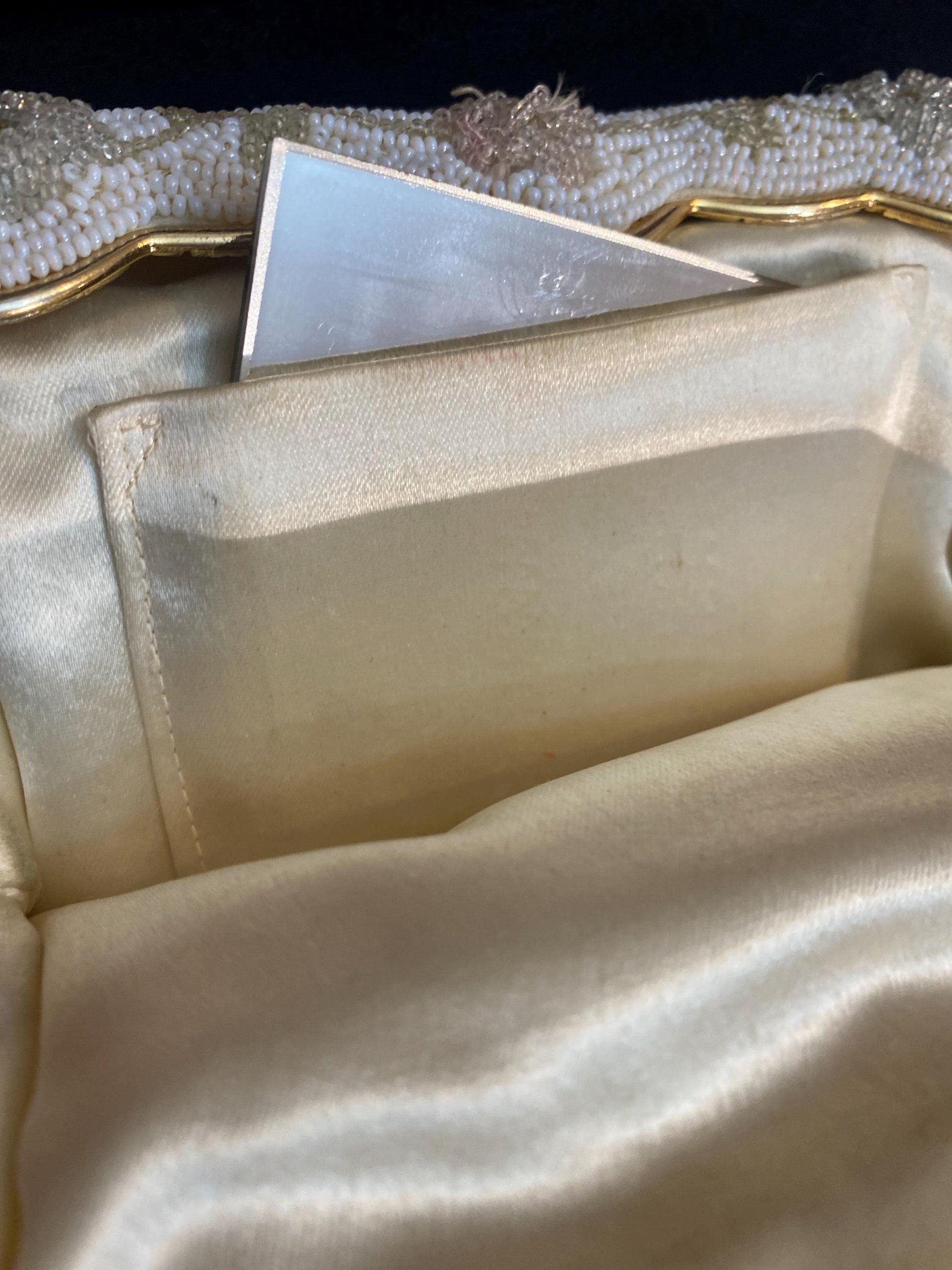 An incredible antique bag made in Italy in the 50s circa, fully embroidered with glass beads in white color with a delicate floral motif on the front, and fully white on the back, and with the handle fully beaded too; white silk lining and with its square mirror still inside the inner pocket.