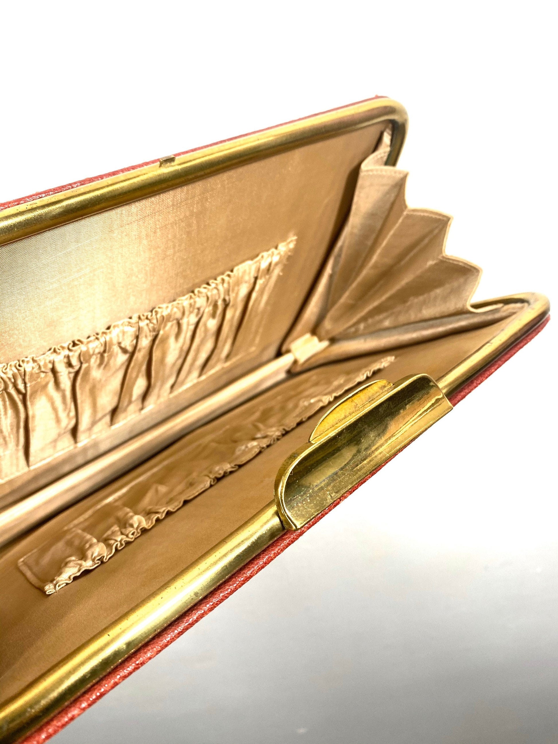 1960s burgundy leather and brass collectible clutch bag in mint condition