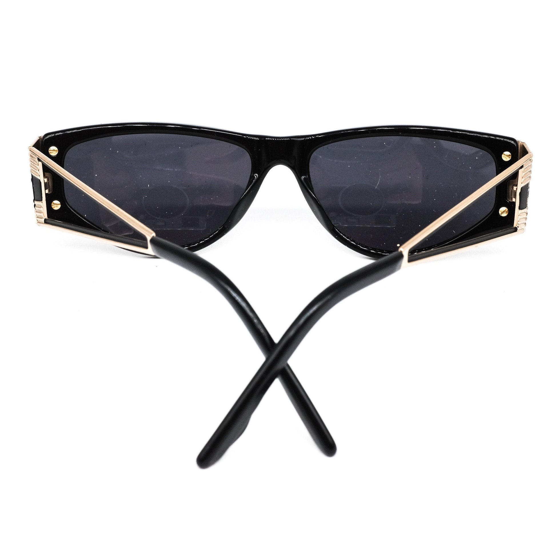 Teardrop shaped lenses in black framed in acetate rim, hinges and temples in golden metal with hinges carved finely with parallel lines and then followed with a triangular shaped cut off temples. with temple tips in black or dark brown tortoise acetate.