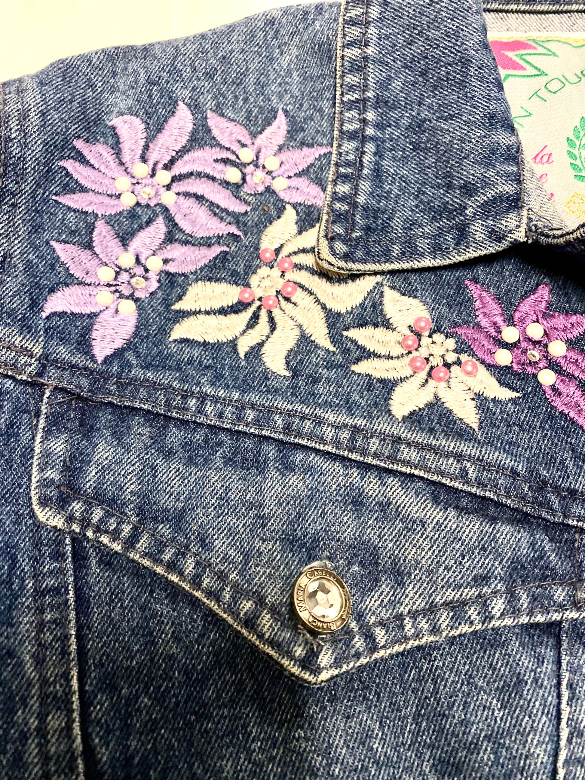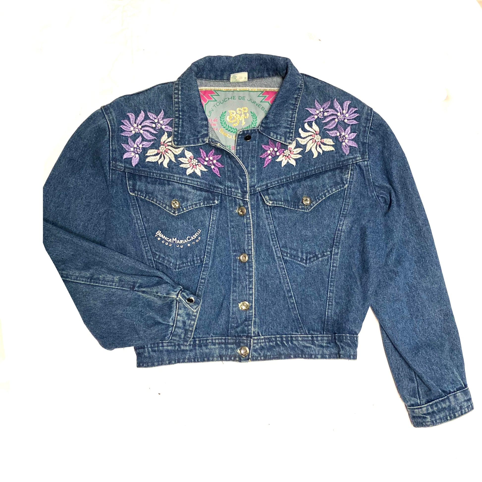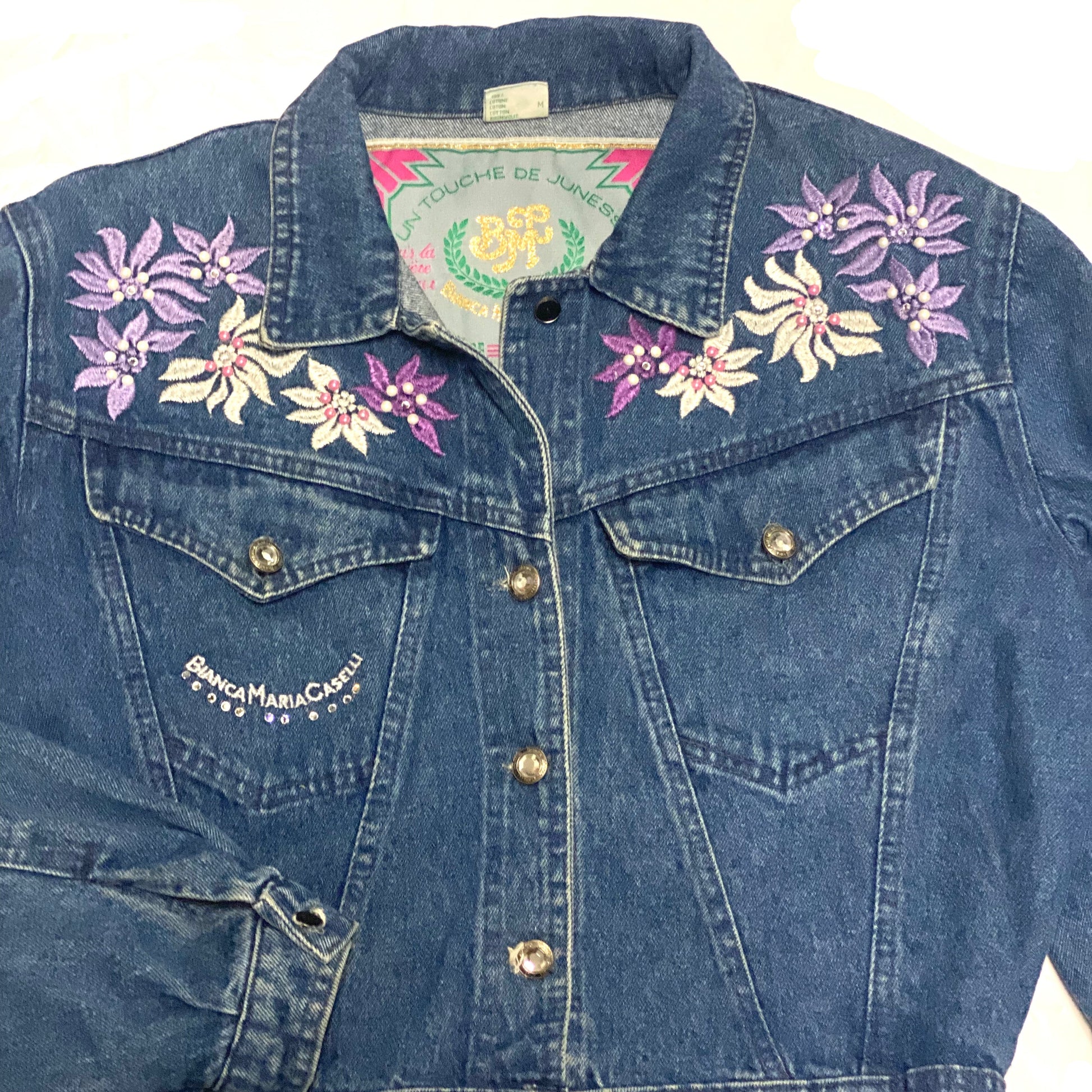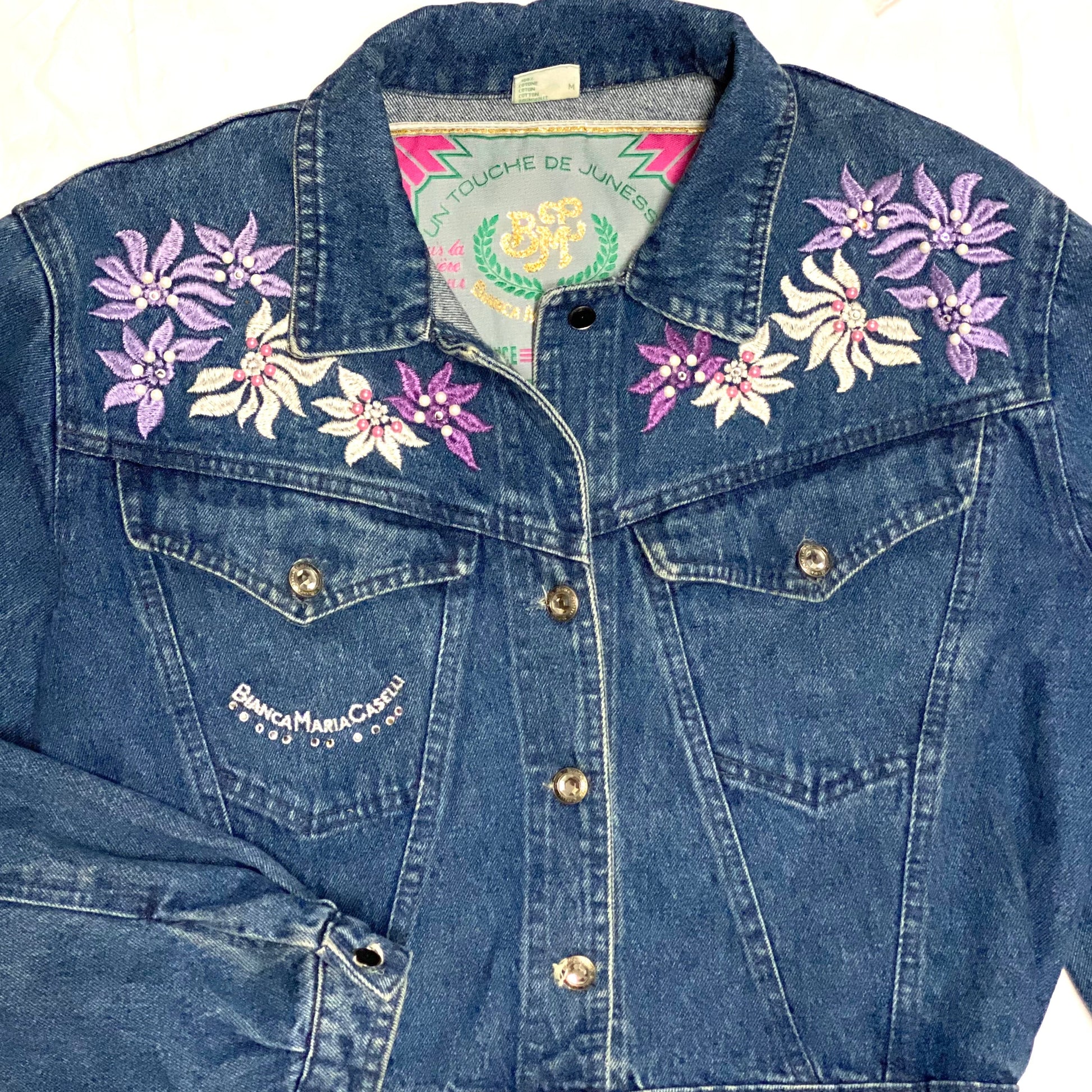 Bianca Maria Caselli ladies denim jacket with lilac floral embroidery 80s Italy