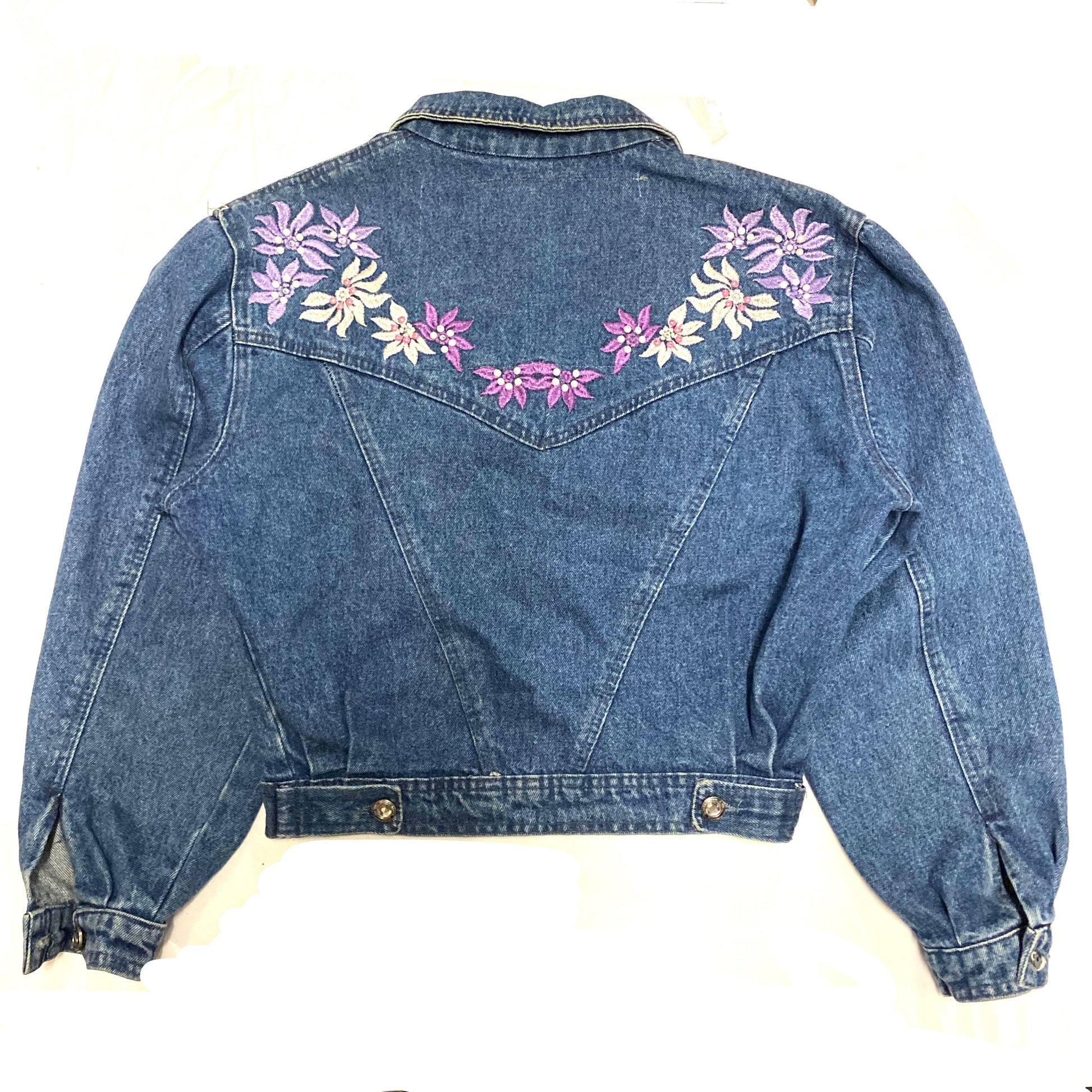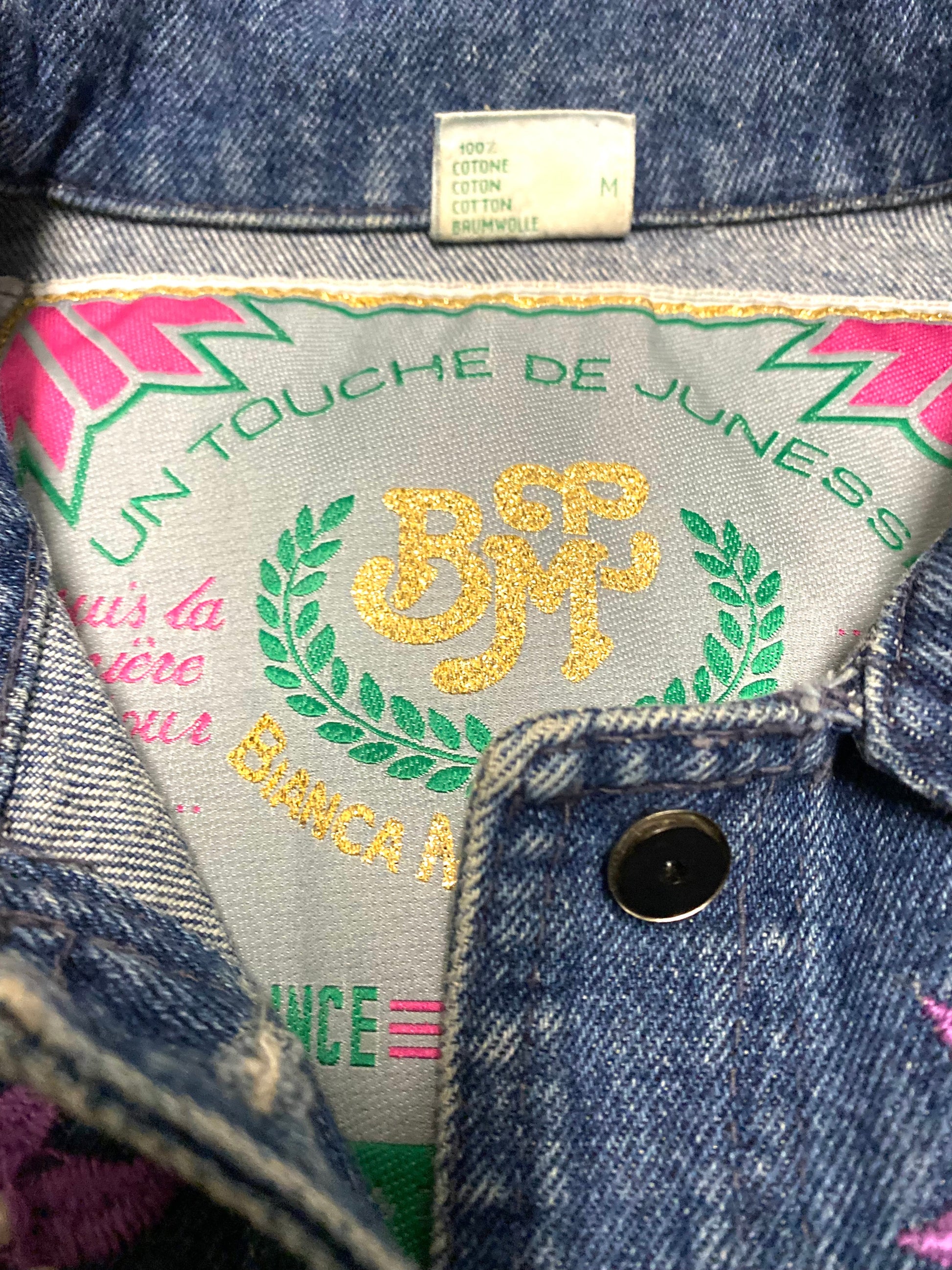 Bianca Maria Caselli vintage 80s ladies denim jacket with floral embroidery all around the front / chest, shoulders and back.
