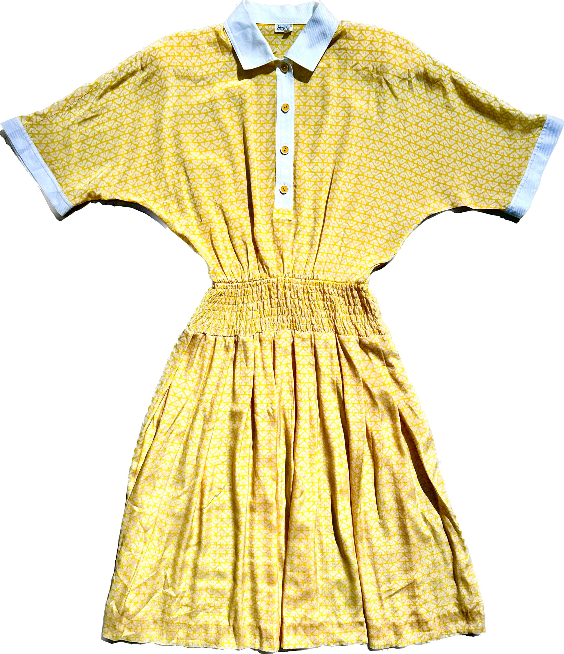 Bugia cute midi dress in a gorgeous canary yellow/white color, printed allover with a cool geometrical motif very recognizably of the era.
