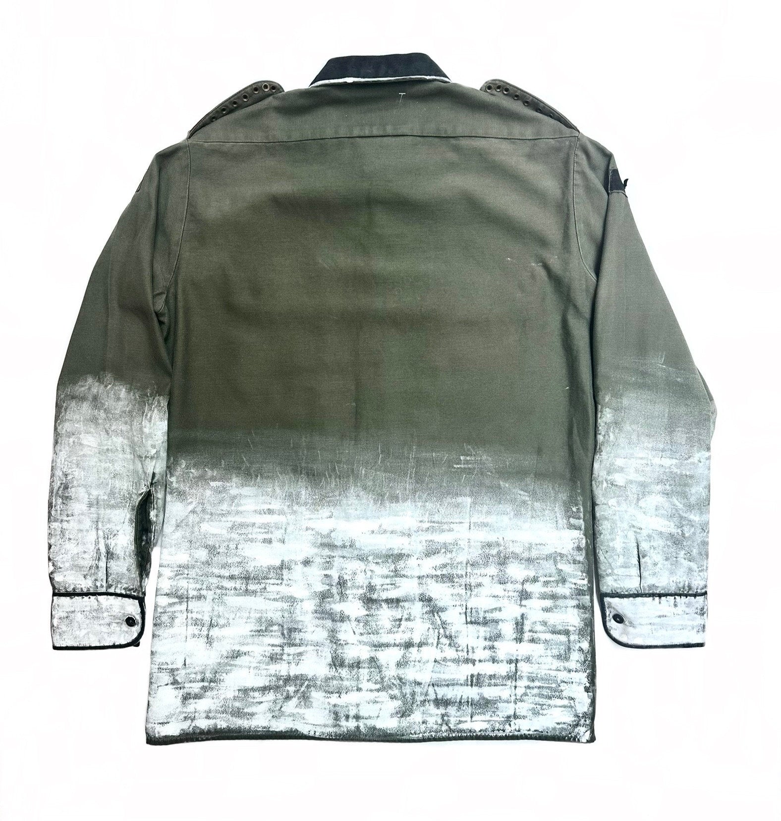 Autentica camicia da campo militare vintage della Germania dell'Est anni '70 dipinta a pennello dall’artista designer con dissolvenza bianca sul fondo e nero su tasche e colletto, dettagli sui contorni, personalizzata con borchie gotiche a forma di croce, punte a cono in bronzo e spille da pipistrello. Pezzo unico 1 di 1. taglia L.
