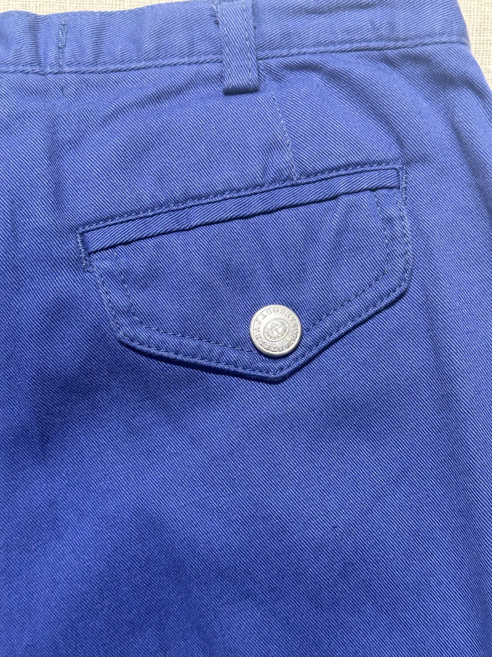 Castelbajac Jeans vintage blu cotton pants from 80s with six pockets and embroidery icons of heart and crown on one pocket, straight comfort fit. Brand new with tags from old stock.