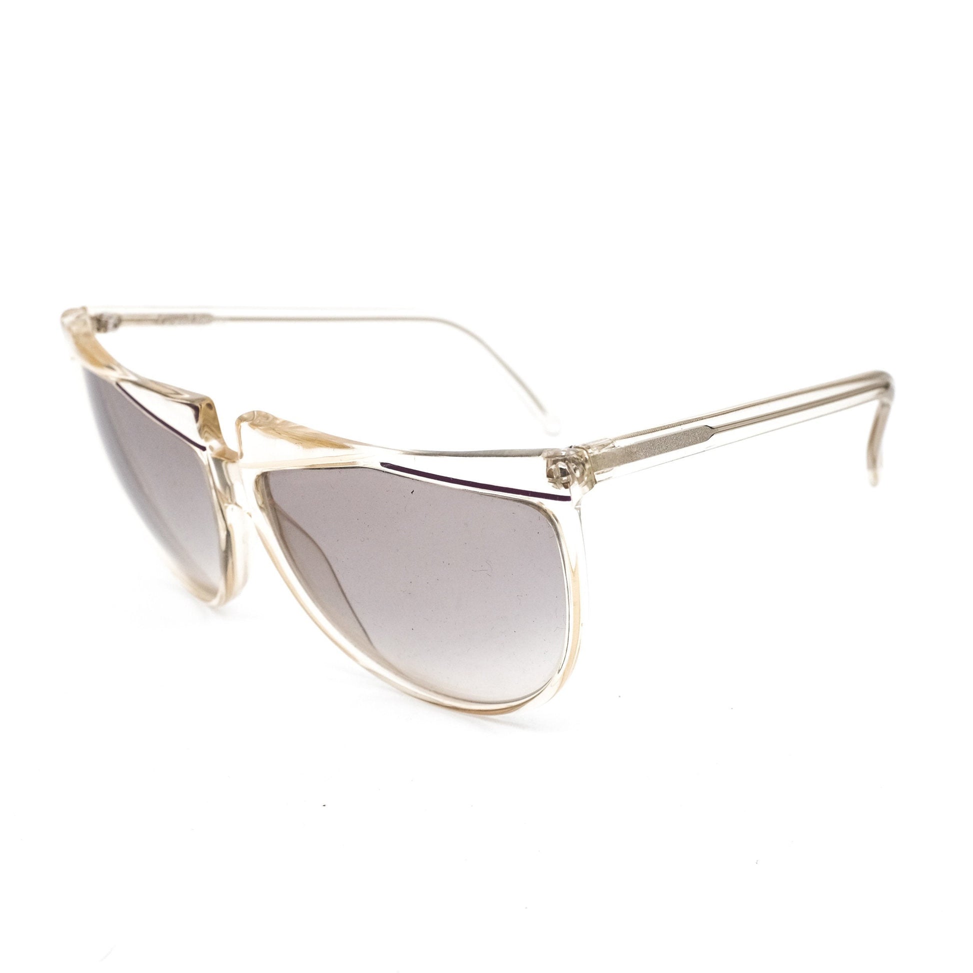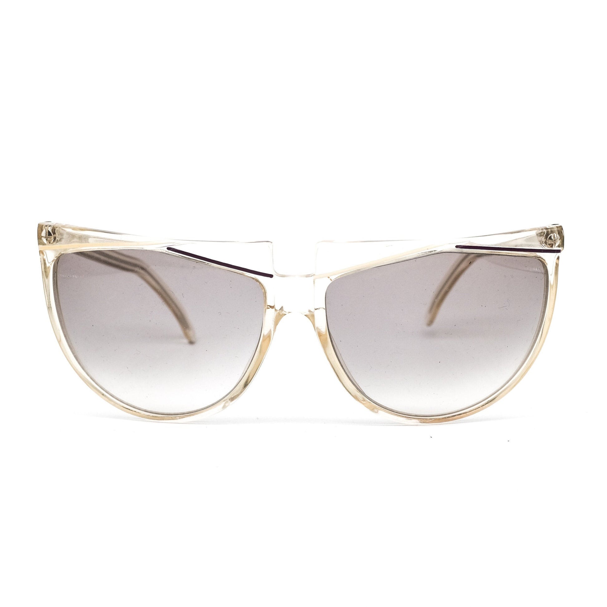 Gianni Versace vintage sunglasses frames in wrap design made in Italy in the 80s. Wwrap drop shaped lenses in grey degrade mounted with clear acetate rim with a hint of yellow accent. Flat browline specially crafted with inspiration from diamond cutting technique combining transparent clear and clear yellowish acetate matterial into a style statement detail.