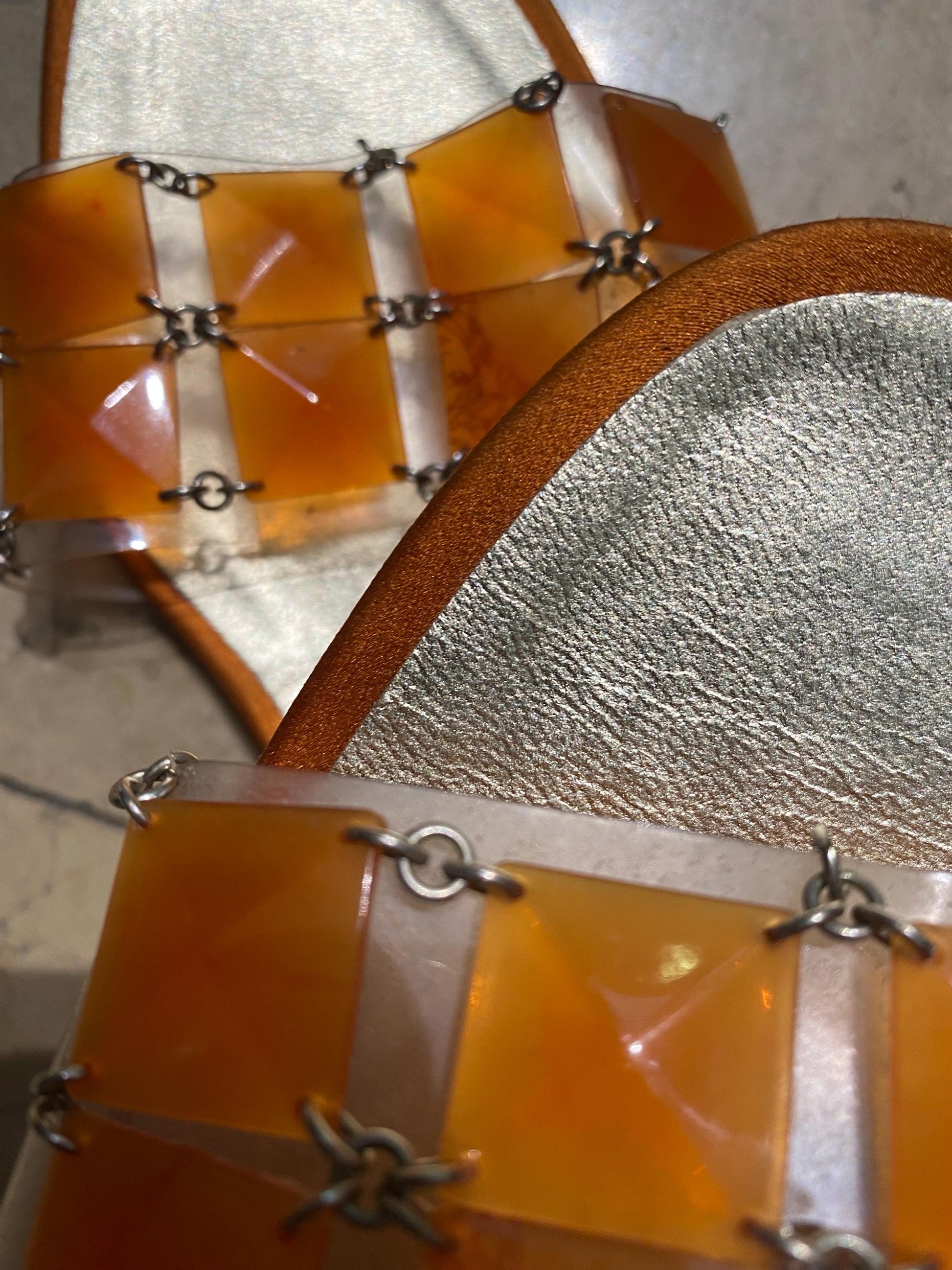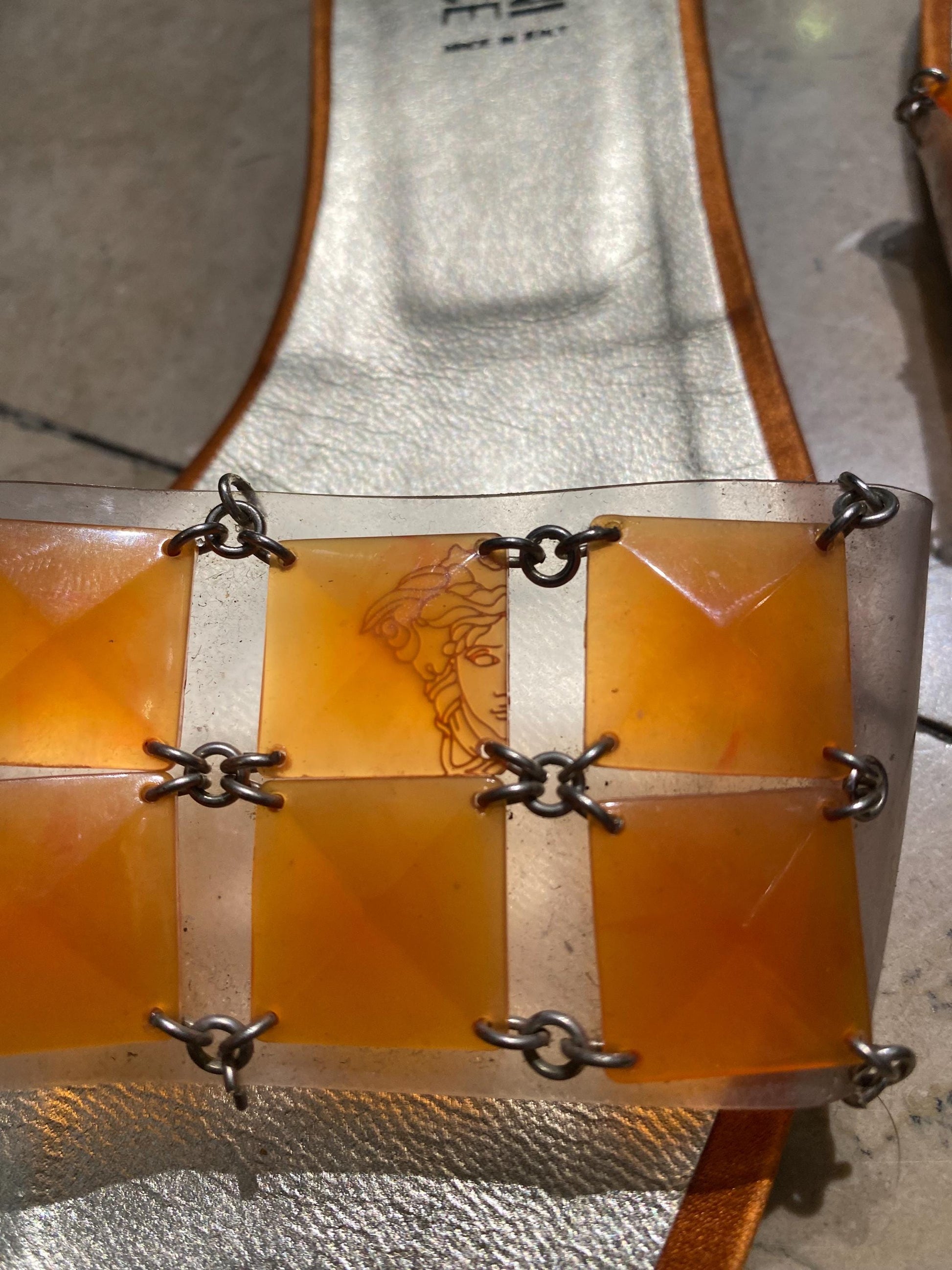 Gianni Versace leather slippers with transparent PVC strap decorated with metallic rings and flat orange pyramids, one of which is printed with the iconic half head of Medusa