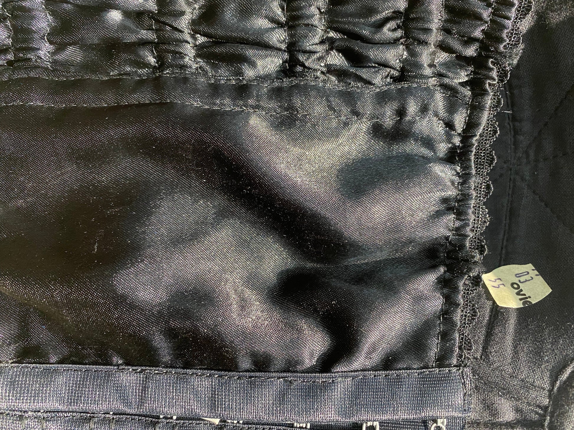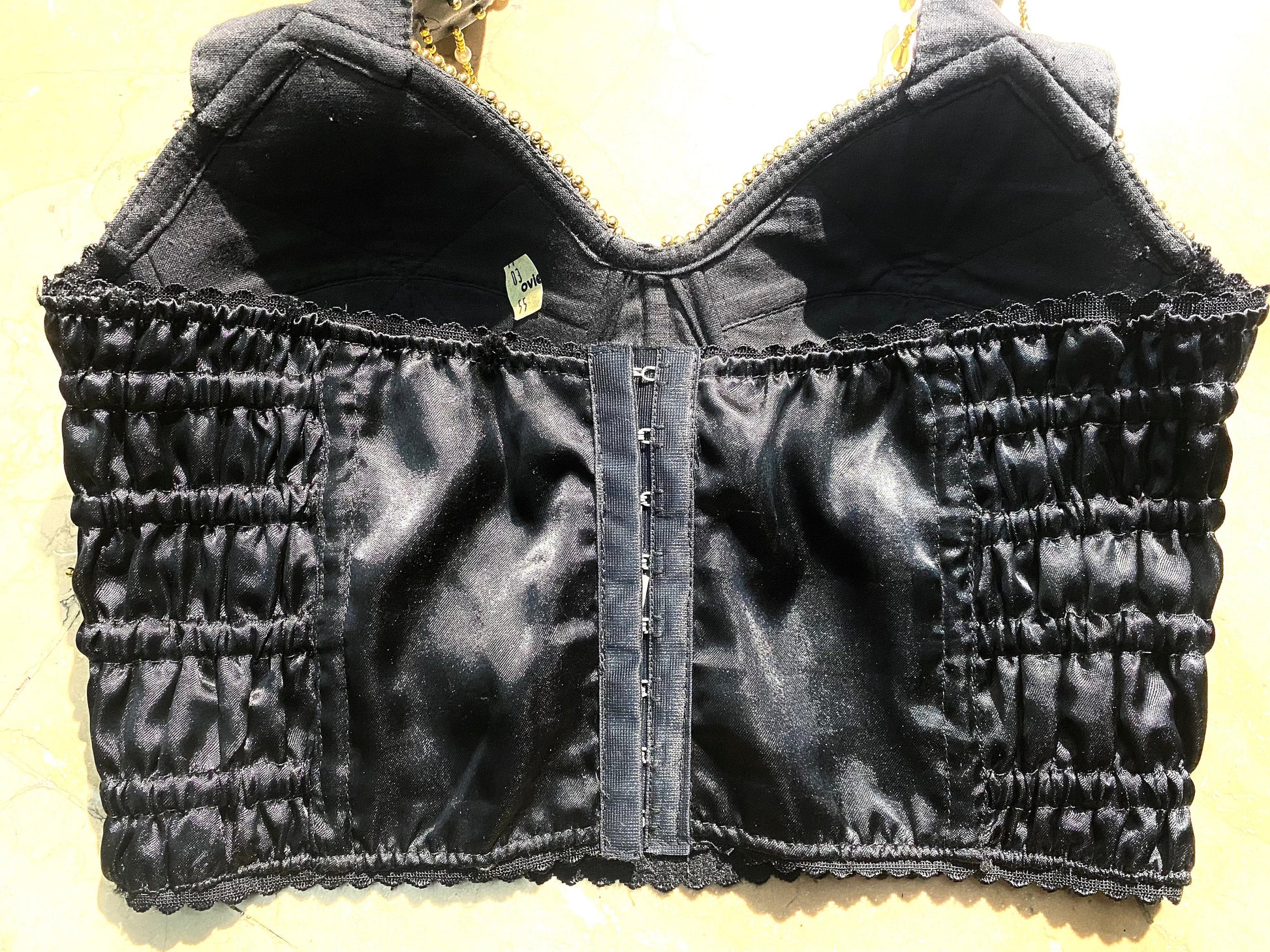 Gioiellò 100% rayon black satin corset with golden + pearl beads and fringes allover, NOS 80s