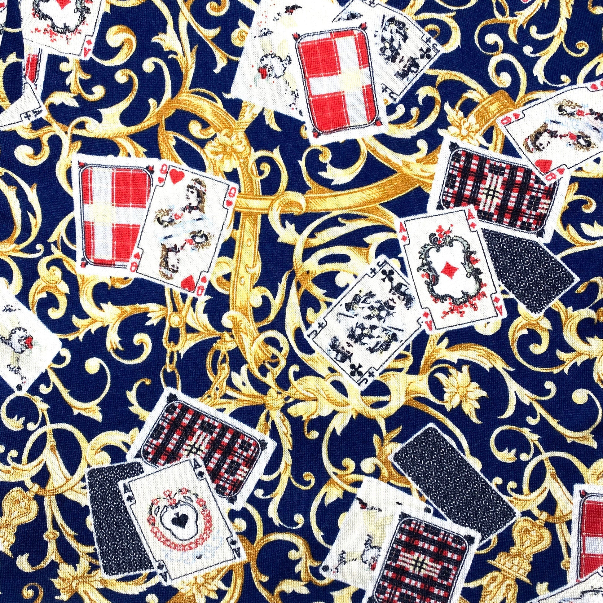 Navy blue base with a crazy Playing cards and golden acanthus leaves pattern.