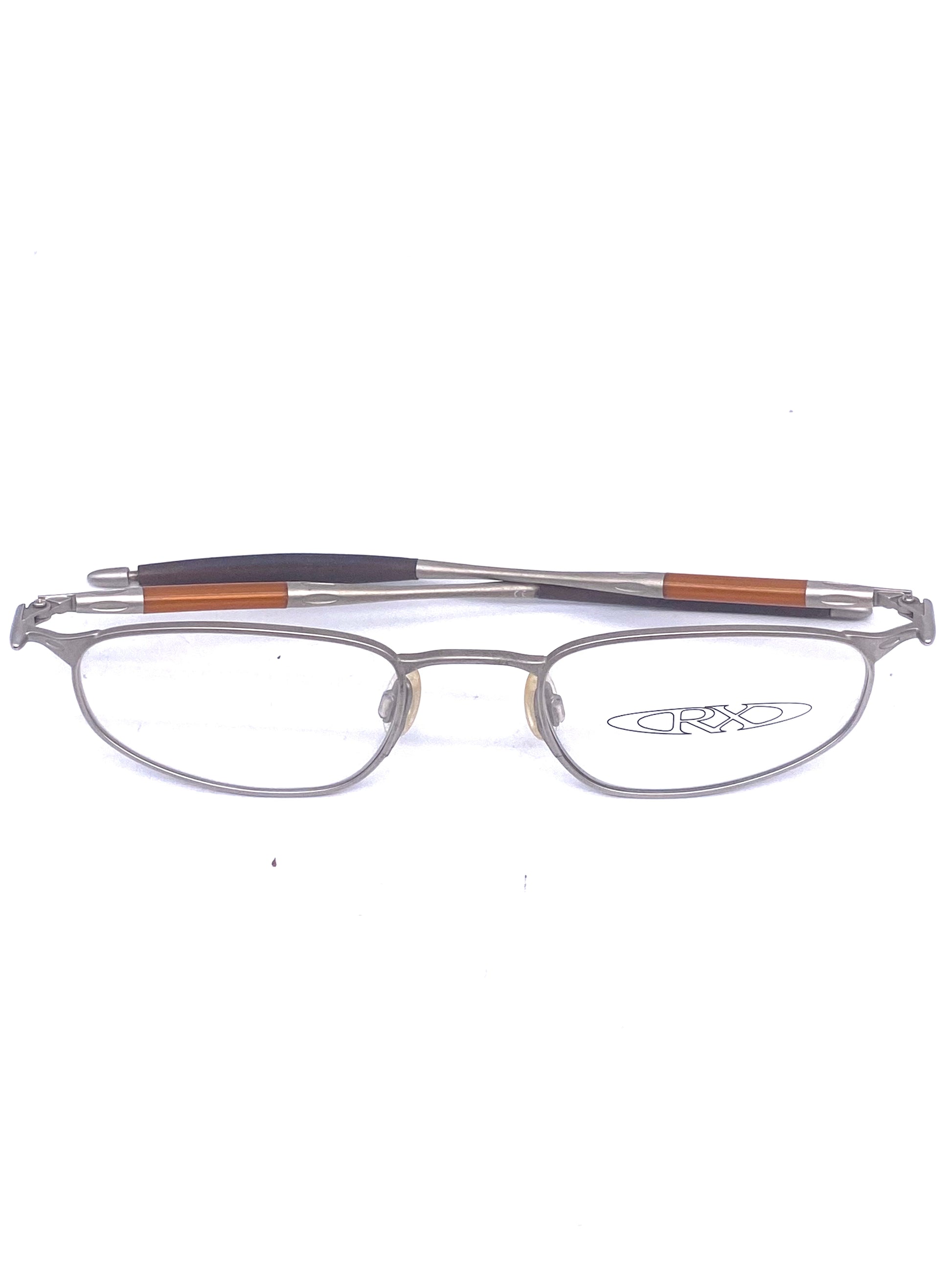 Oakley RX oval slim satin silver eyeglasses frames brand new and unworn from deadstock. Made with the finest quality with brushed finishings, rubber temple tips ano the typical Oakley sporty style, avant Garde detailing allover.