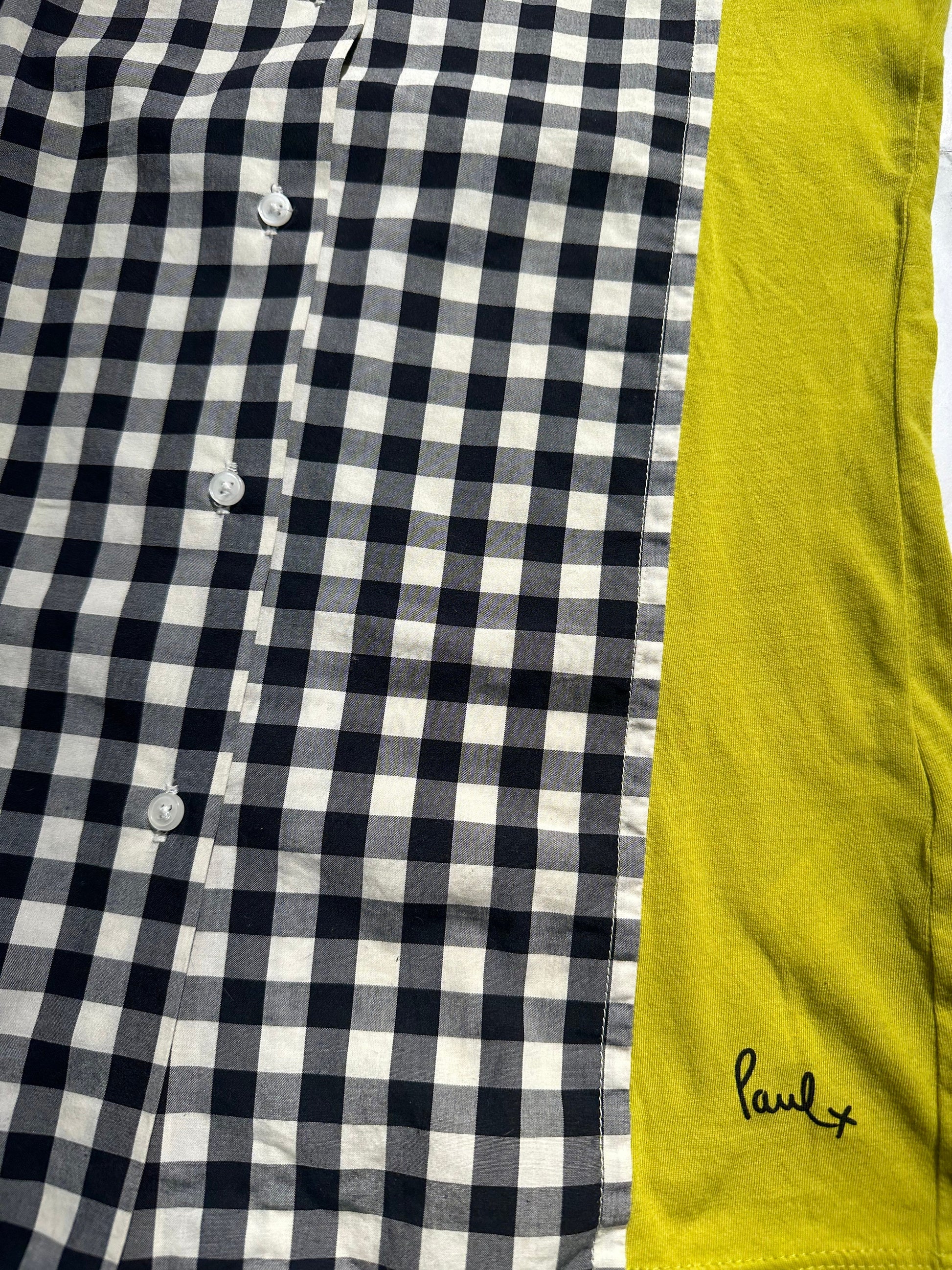 Paul Smith cute checkered black white blouse/ t shirt made blending a classic acid green soft cotton and a checkered b/w insert in classic Oxford shirt’s fabric at the center with button closure.