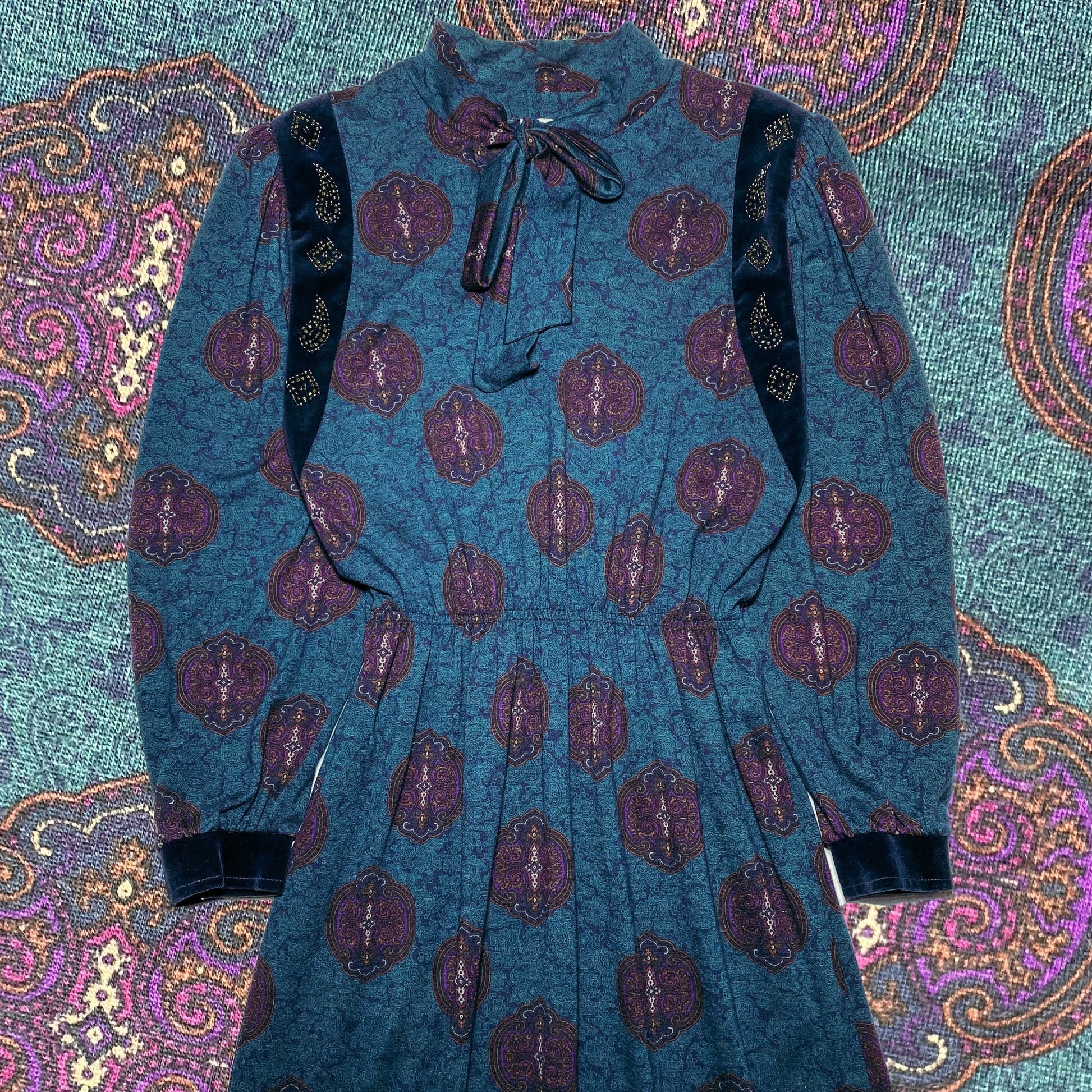 Petrol green and navy blue paisley base with purple/orange baroque motif allover and black velvet details at the cuffs and around the shoulder.