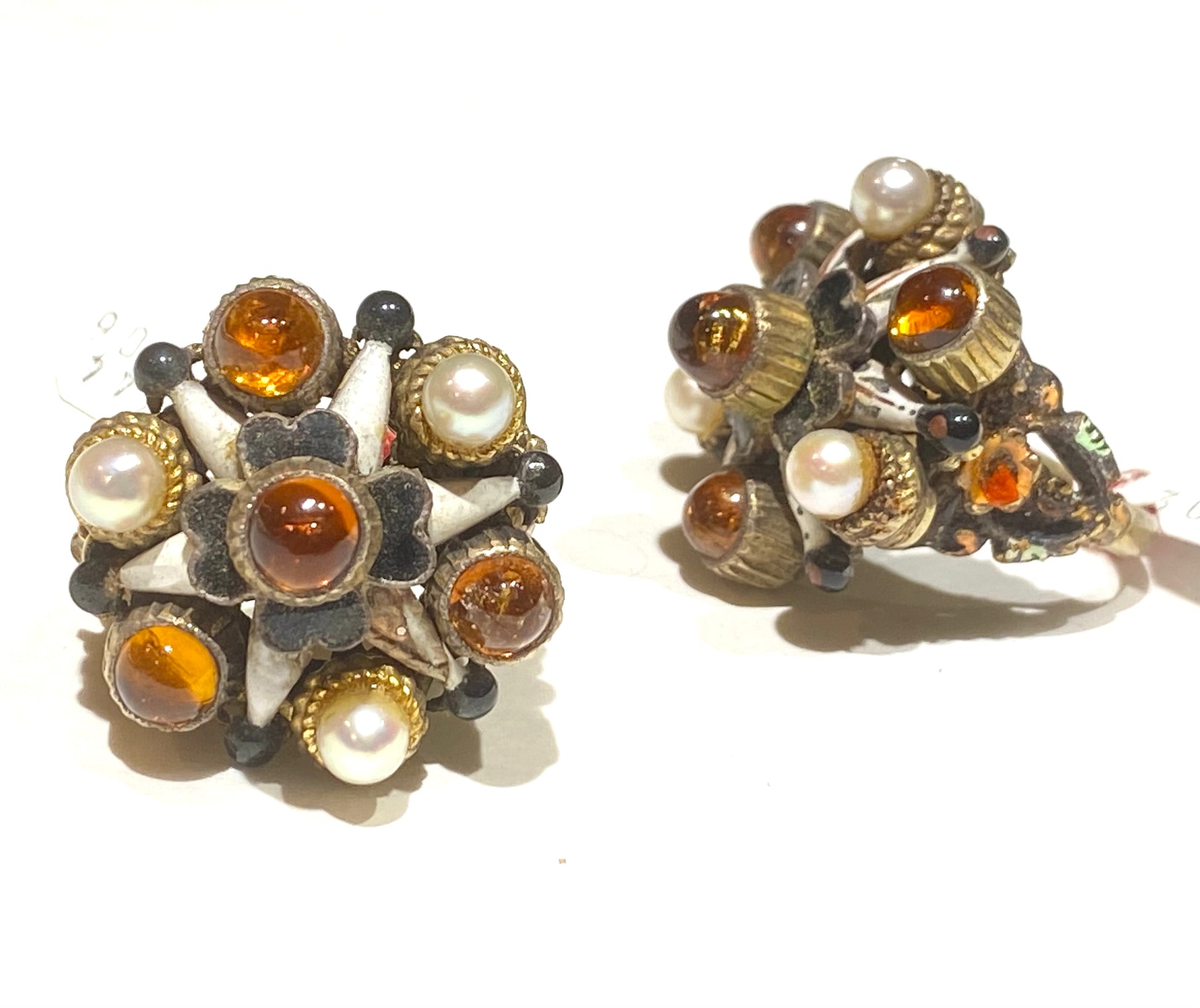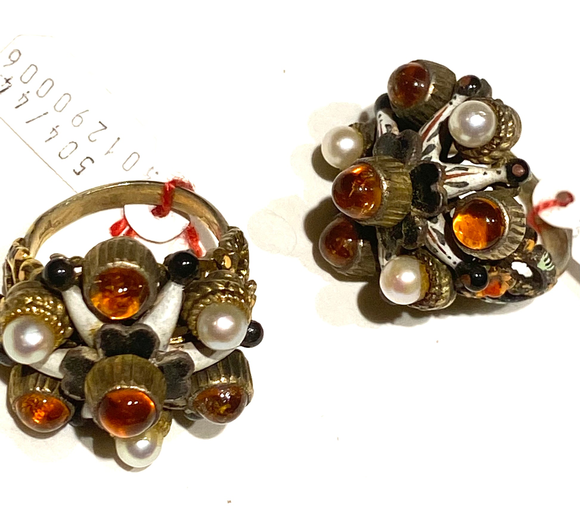 1960s NOS precious hand made rings realised in gold plated 925 hallmarked silver, with natural pearls & amber spherical stones on a baroque style framing full of carved and cutoff details, black & white enameled win star alike framing to the central stone, little daisies enameled in orange on the sides of the band.